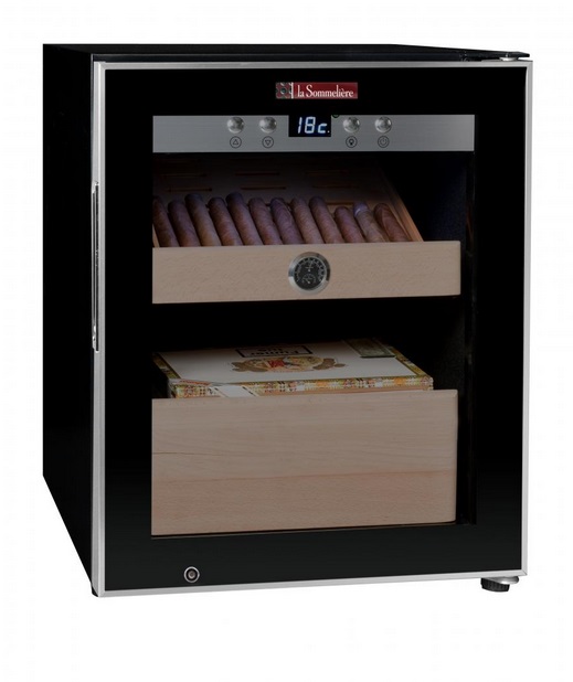 Почитателям, заинтересованным в покупке небольшого шкафа, стоит остановиться на хьюмидоре La Sommeliere CIG250, рассчитанном на 250 сигар. Эта модель придется по вкусу тем, кому привык использовать популярные сейчас боксы для сигар, но хотел бы обзавестись более основательным оборудованием. Сигарная коробка снабжена небольшой ванночкой, которую требуется заполнять водой вручную и постоянно контролировать уровень воды, а в шкафу La Sommeliere CIG250 автоматически поддерживаются правильные температура и относительная влажность, а кроме того, имеются практичные полки, одна из которых может размещаться с наклоном для демонстрации содержимого. Скромные габариты и стильное исполнение допускают его размещение даже на столе.