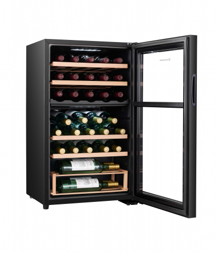Двухзонный шкаф для вина Climadiff CEPAGE33DZ на 33 (15+18) бутылок стандартного типа Бордо, подойдёт тем, кому необходимо место для качественного хранения винной коллекции. Цвет корпуса и рамки двери - черный, компрессорный, 2 зоны (5-20 / 5-20 ° C), электронное регулирование, закаленный двухслойный стеклопакет (цвет серый)  с анти-УФ-обработкой.